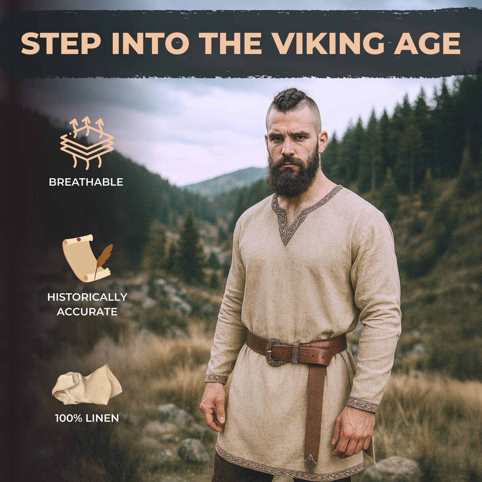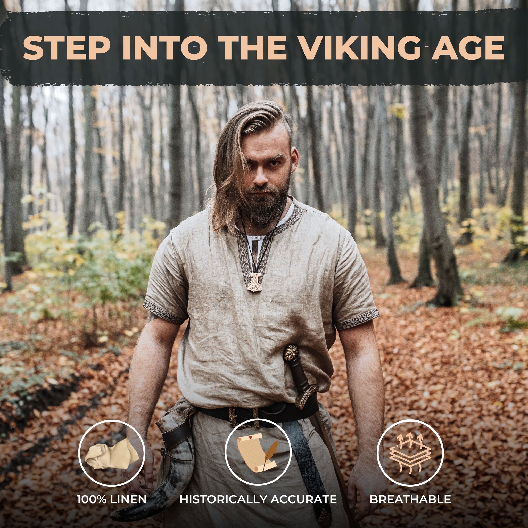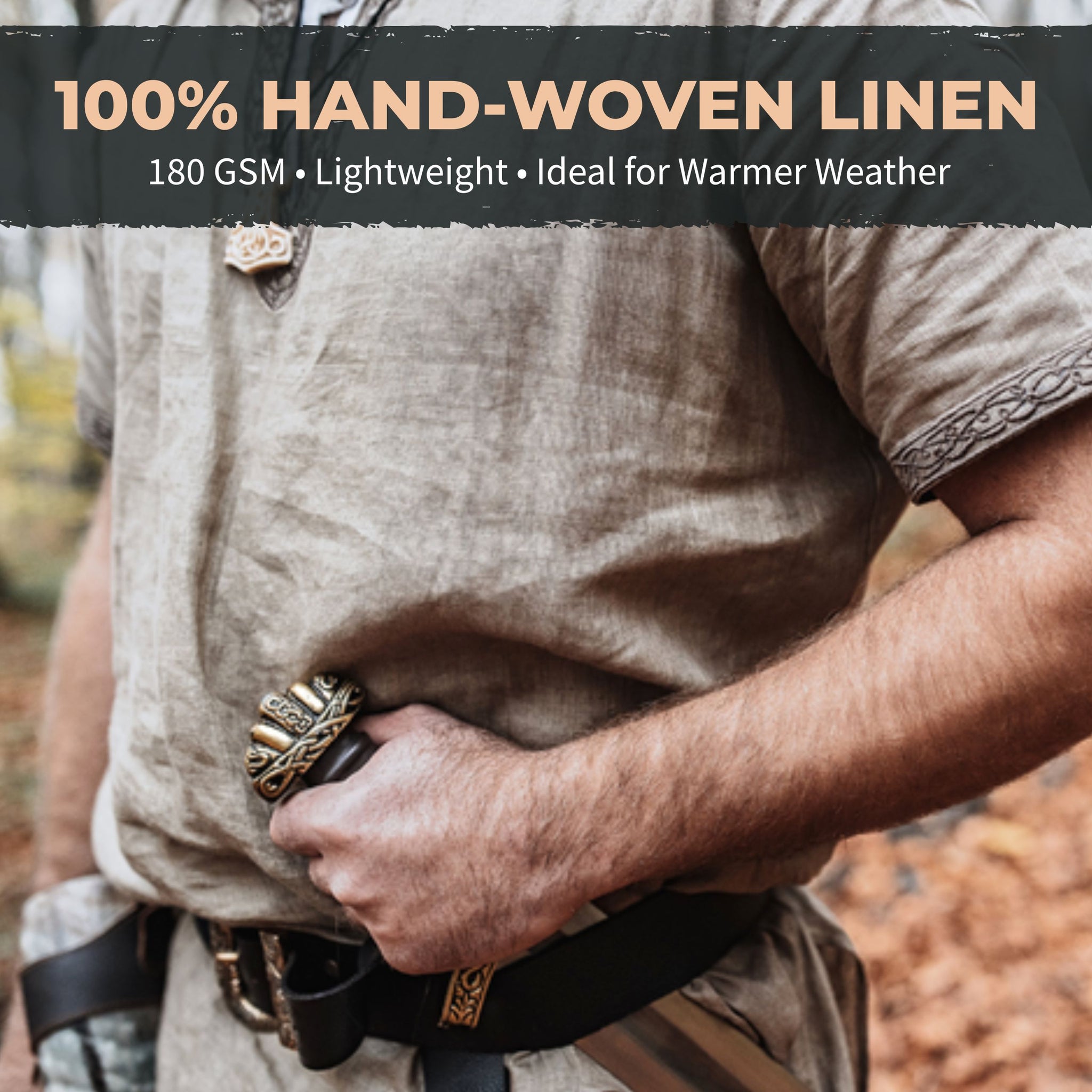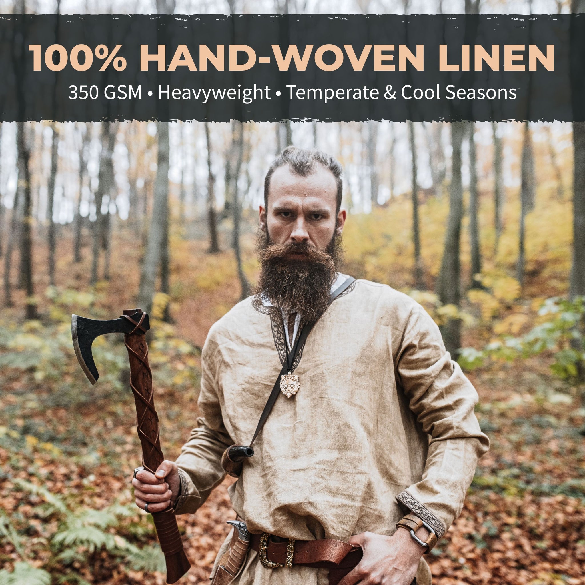 PURE QUALITY LINEN - Our Norse tunics are made from naturally dyed, hand-woven linen fabric The long-sleeve version is 350 GSM, meaning it has some thickness and warmth to it, making it suitable for moderate to cooler temperatures. Our short-sleeve tunic is 180 GSM, making it more appropriate for warmer climates.