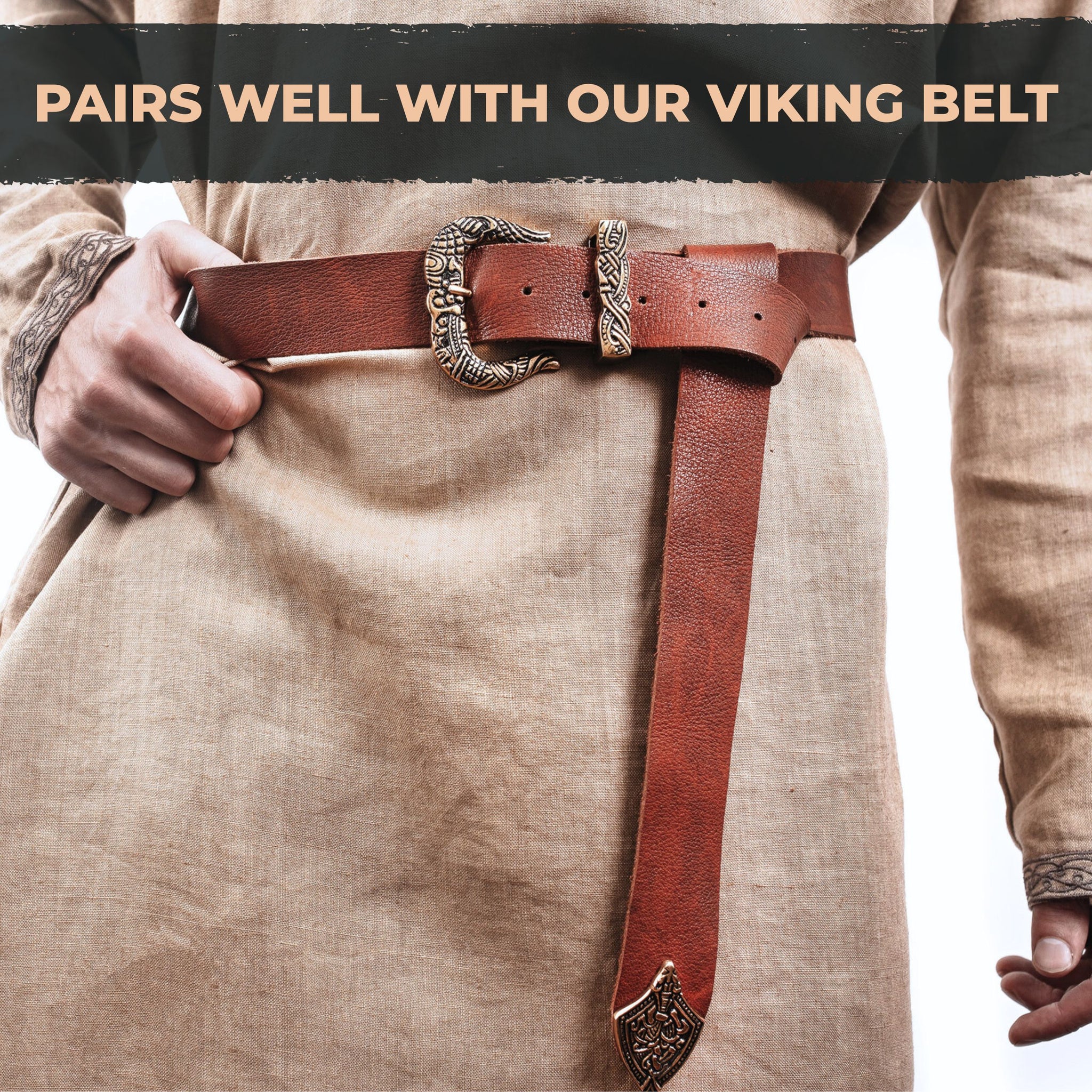 CAREFULLY EMBROIDERED - Using a sewing machine, our tailors accent this beautiful tunic with Norse style knot patterns in brown colored thread. The embroidery work is done on the front neck, sleeve ends, and on the shirt-tail.
