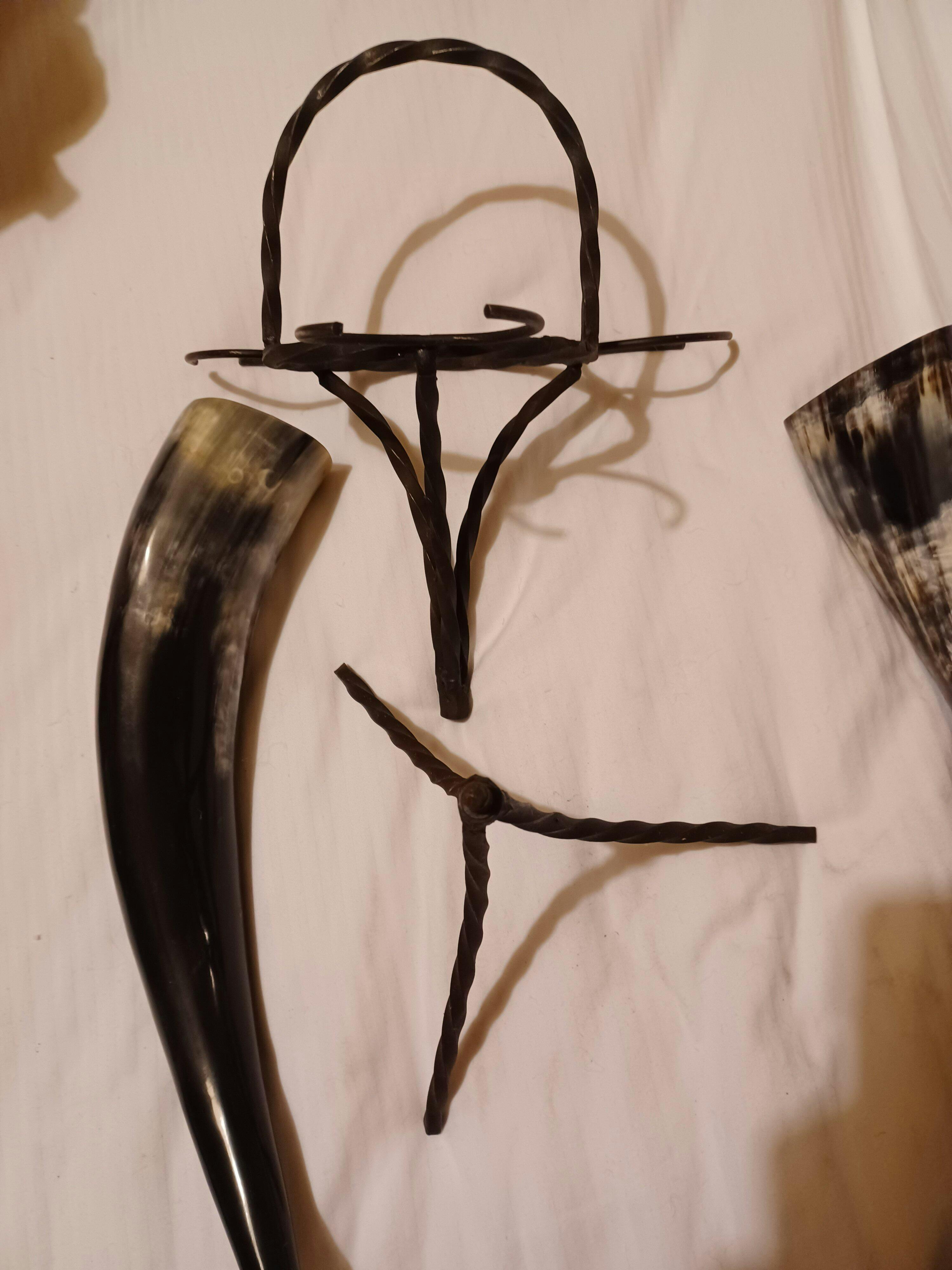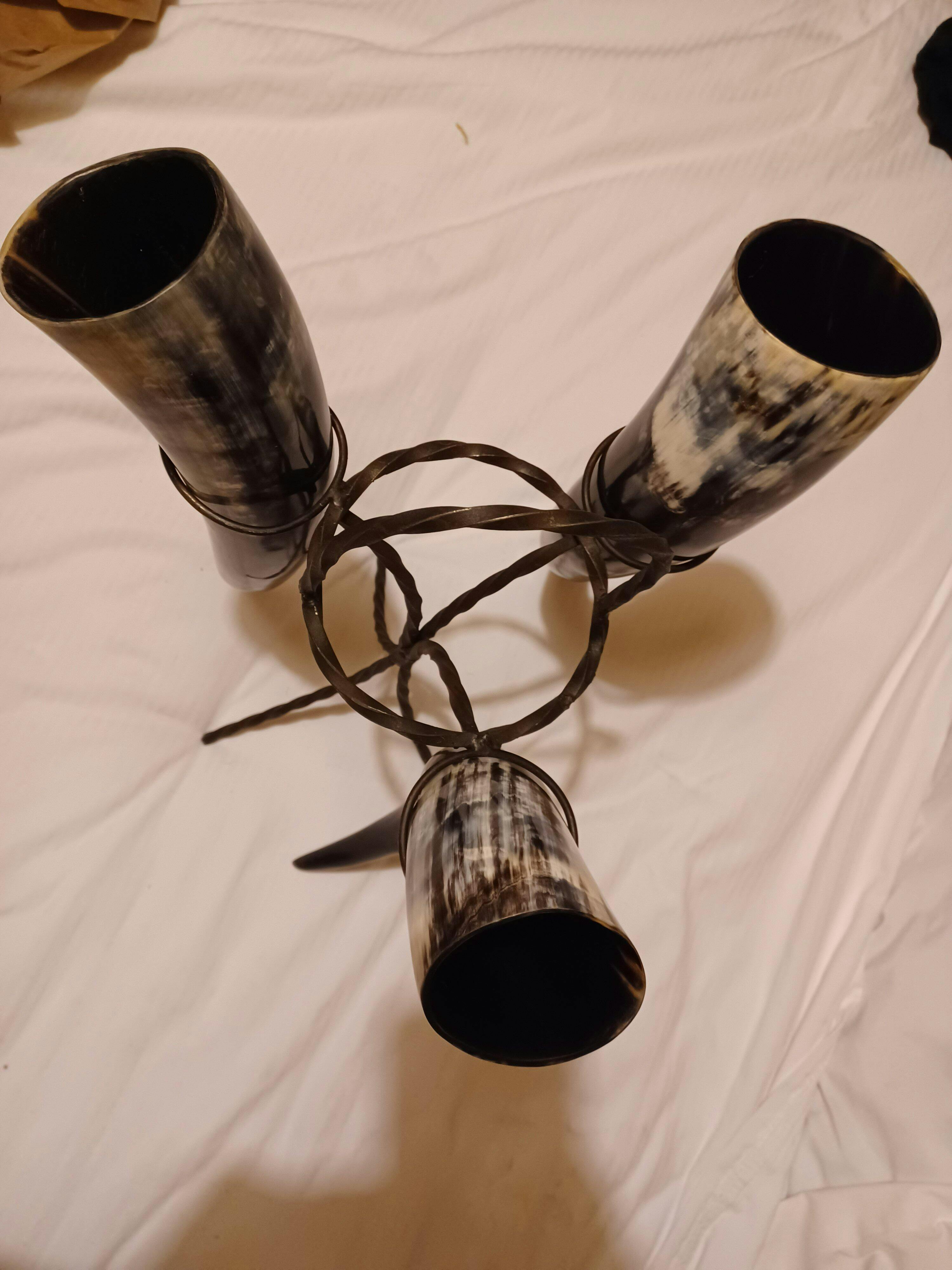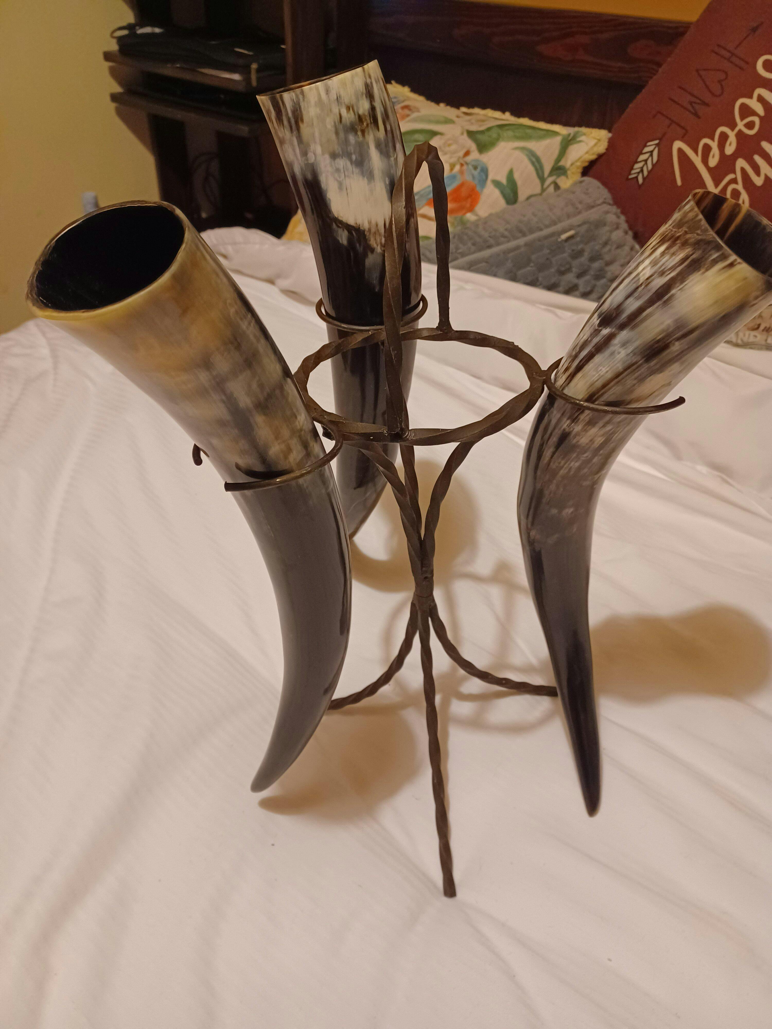 RUSTIC CENTERPIECE SET - Includes three 20" drinking horns and a sturdy iron stand, perfect for a group of friends to enjoy together. The stand also doubles as a rustic-style decorative piece for your home when the set is not in use.