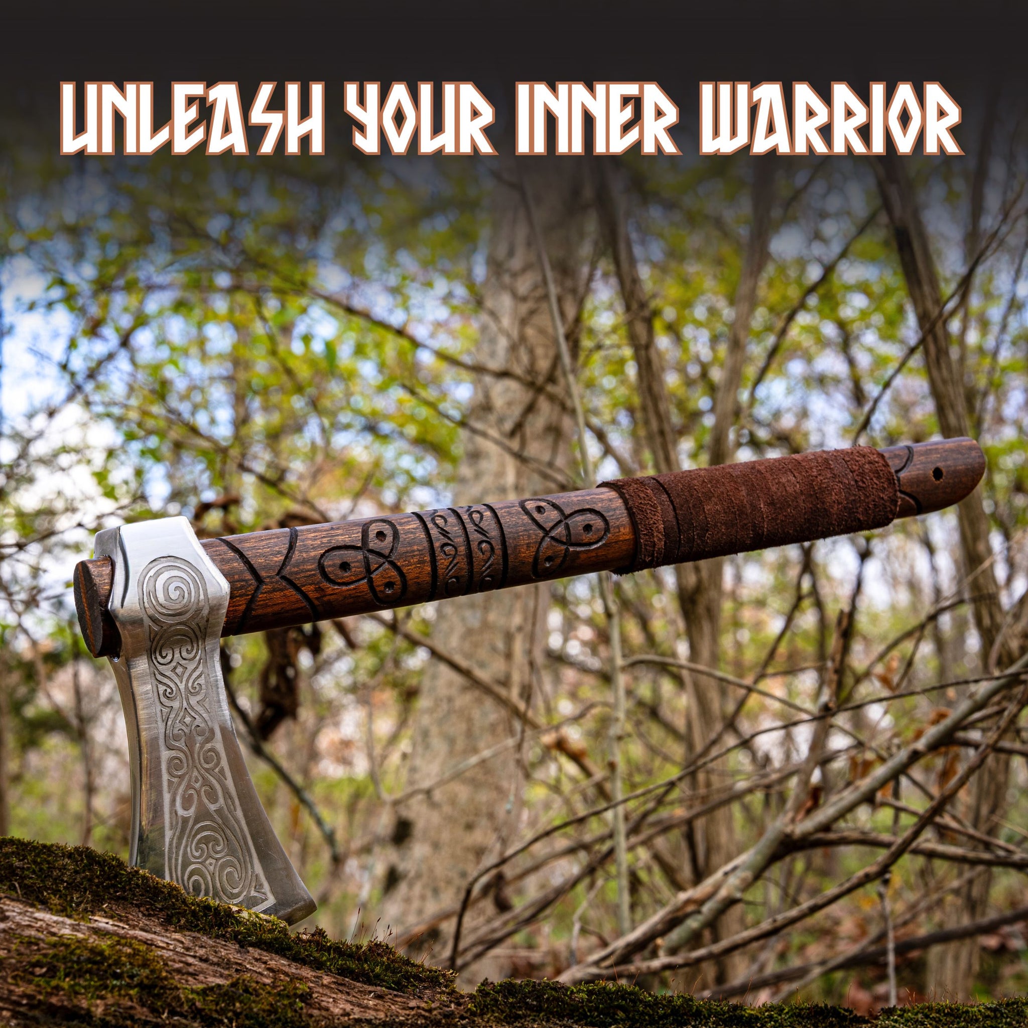 – Crafted from dense, rot-resistant teak. The 16.5" haft has an antique dark-brown finish and detailed Norse wood engravings that mirror patterns found in Viking art and tool handles.