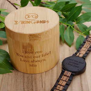 Unique, high-quality wooden watch, engraved with Thor's hammer - mjolnir, runic circle & personalized engraving with your own message on the back & on the box.