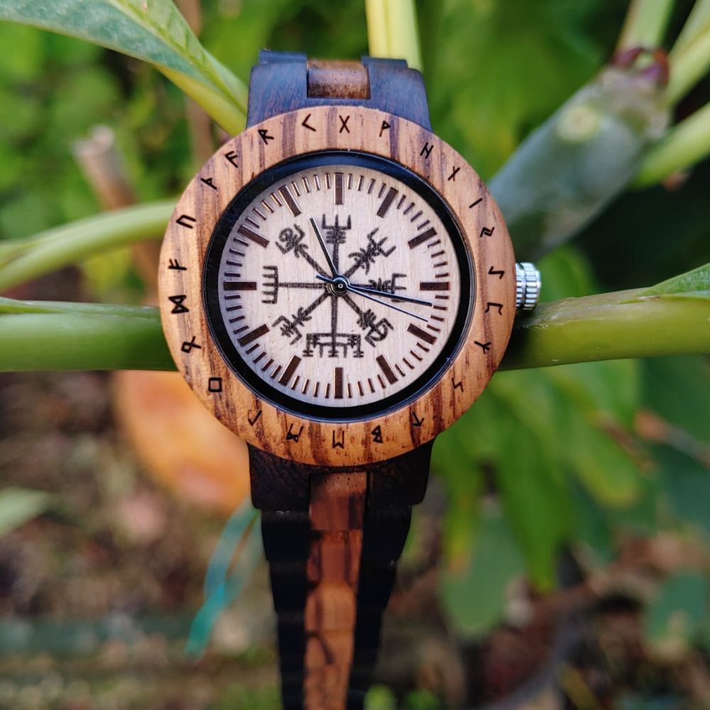 Unique, high-quality wooden watch, engraved with Vegvisir & runic circle.