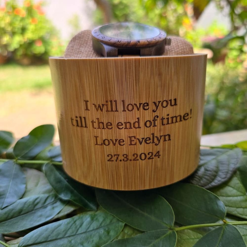 Please type your desired engraving in the personalization box. (No emojis please) Watch: Max 65 characters on back side for best results. Box: Max 65 characters on the box for best results. Remember: less is more. Please double check your personalization message and make sure everything is correct before completing the order (Including commas, Capital letters..). Once the engraving is done, it's permanent, there is no option for changes, cancellations or returns.