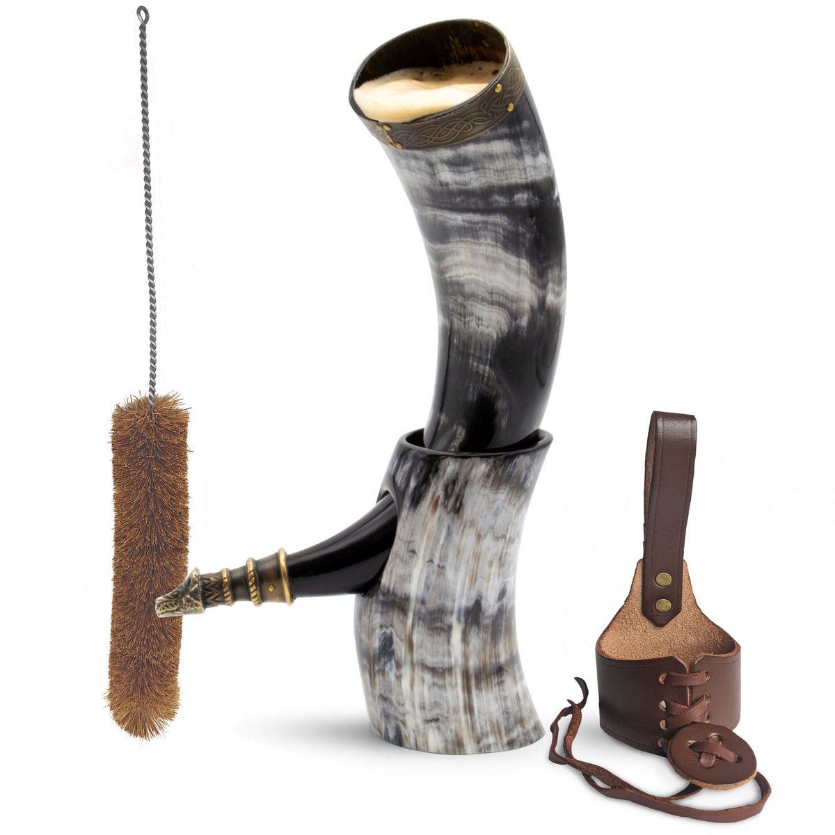 Drink like a true Norse warrior with our genuine ox horn drinking vessel. Each horn is uniquely hand-polished and comes with a fitted stand, a leather belt holster, a coconut fiber cleaning brush, and a burlap gift sack. Every sip is a tribute to Viking history and craftsmanship.