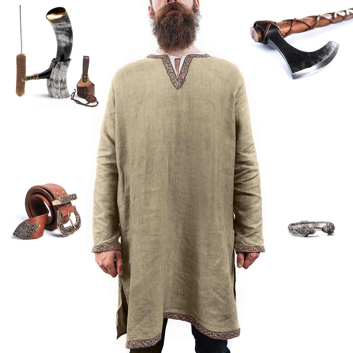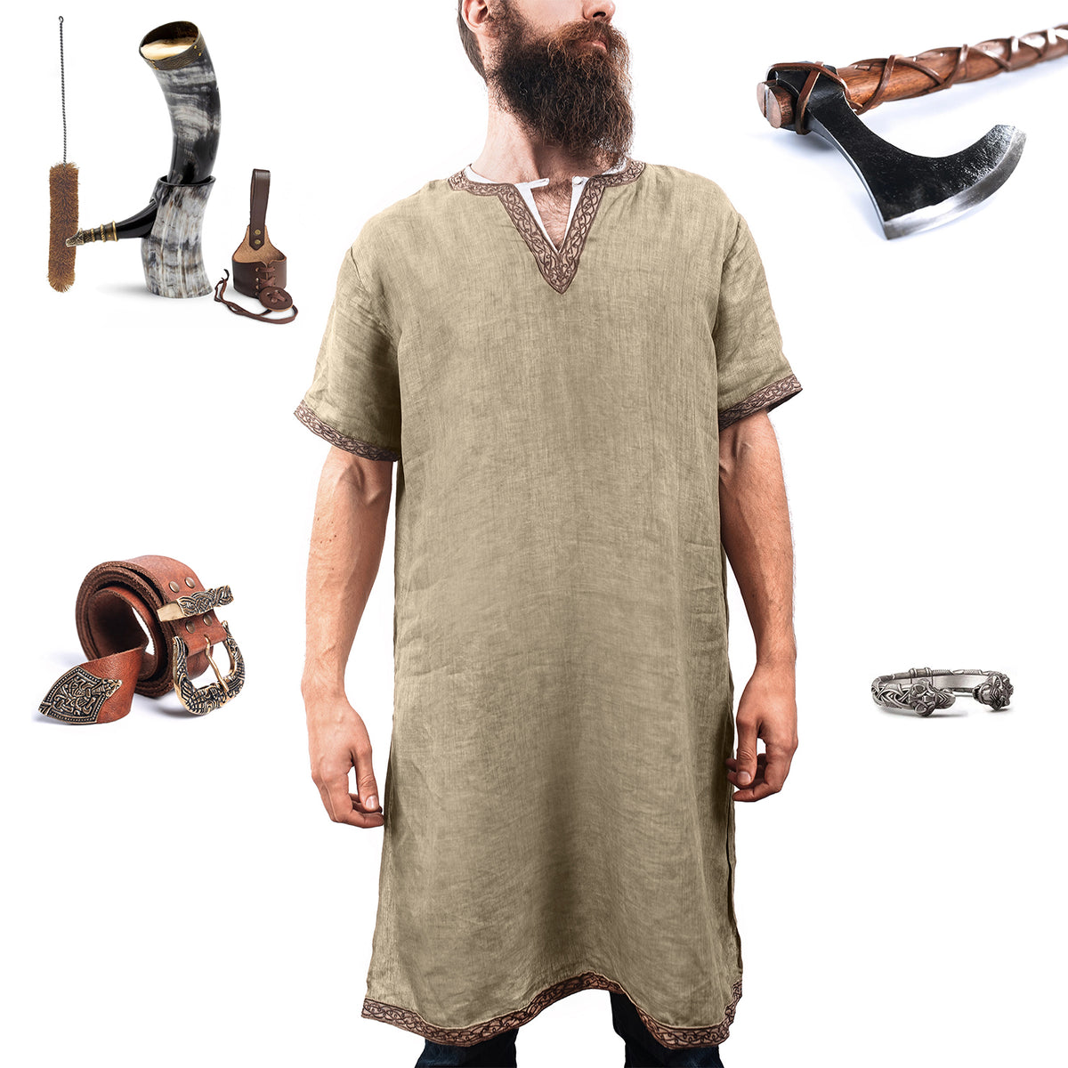 Our Norse tunic is crafted from naturally dyed, hand-woven linen, designed to be both durable and authentic. The long-sleeve version is 350 GSM, perfect for cooler temperatures, while the short-sleeve tunic is 180 GSM for warmer climates. Carefully embroidered with Norse-style knot patterns on the neck, sleeves, and hem, this premium reenactment attire is a perfect addition to your medieval wardrobe.