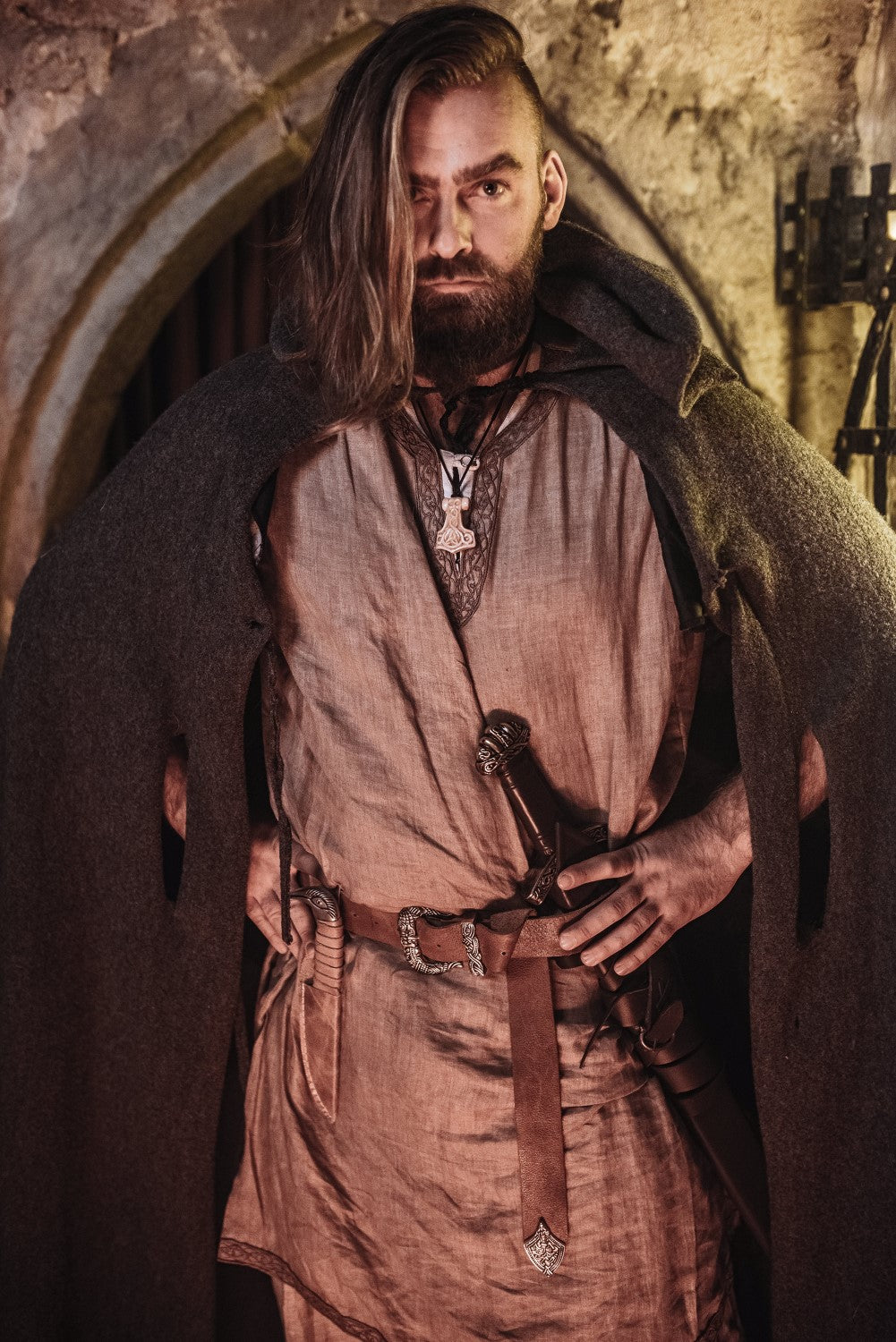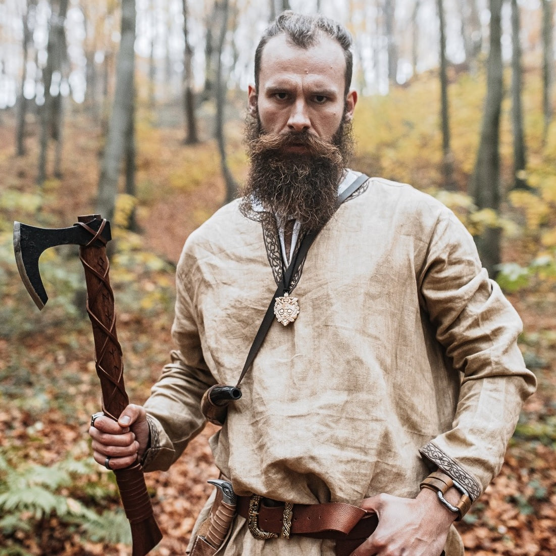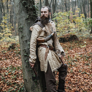 Includes: Linen tunic, Bearded Battle Axe, Curved Drinking Horn, Wolf Bracelet, and Brown Leather Belt with Brass Buckle & Tip. Get