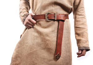 Crafted from full grain buffalo leather, this medieval belt features a solid brass buckle and tip, with detailed Norse knotwork engravings. At 62” long and 1.75” wide, the belt is designed in the traditional Borre Viking style, perfect for completing any period ensemble.