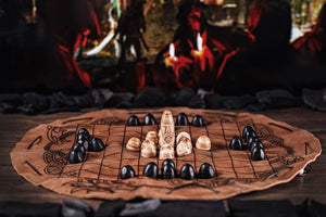 OX-BONE & WOOD PIECES - This Hnefatafl set comes with 37 genuine game pieces. Each piece is totally unique, as they are carved and polished by hand. The attacking pieces (black) are made from dyed teak wood, while the defending pieces (white) are made from genuine ox-bone.