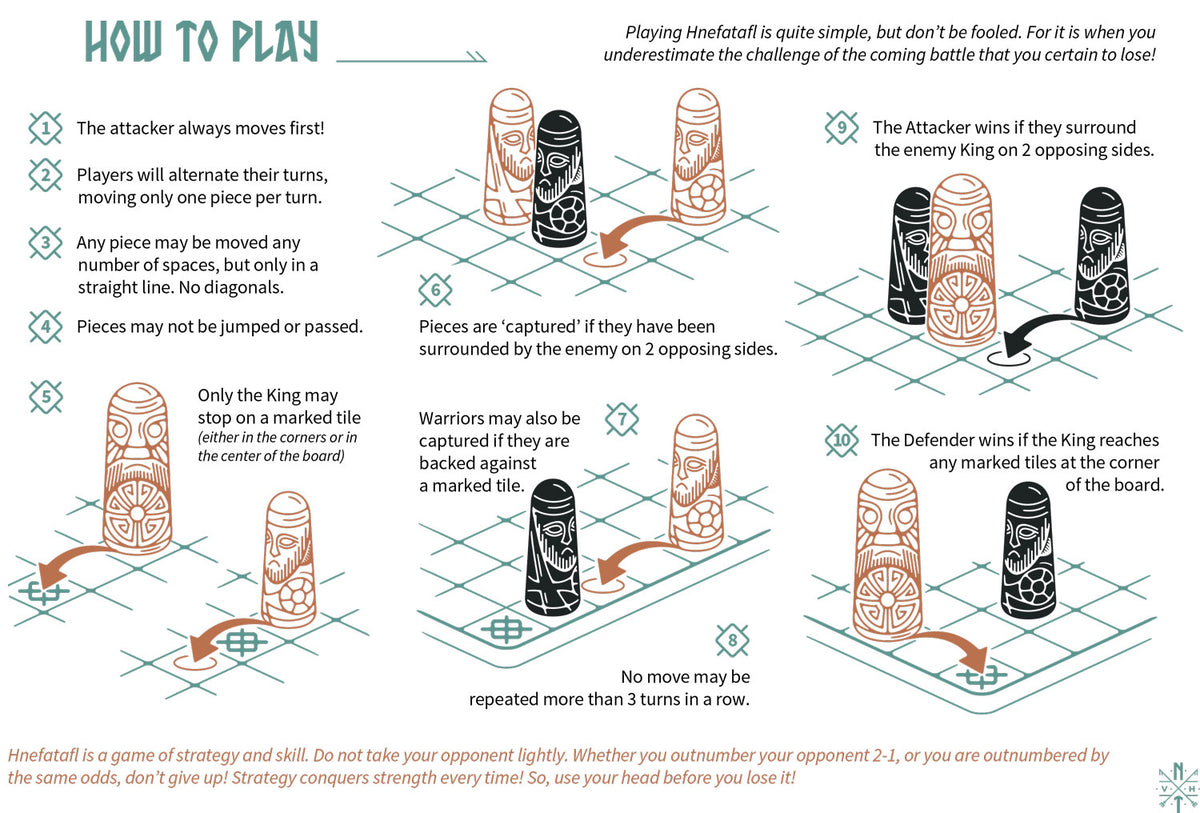 🕯️ HOW TO PLAY - Each order includes a physical guidebook with complete instructions and diagrams. You can also click HERE view the guidebook online. Playing Hnefatafl is quite simple, but don’t be fooled. For it is when you underestimate the challenge of the coming battle that you certain to lose!