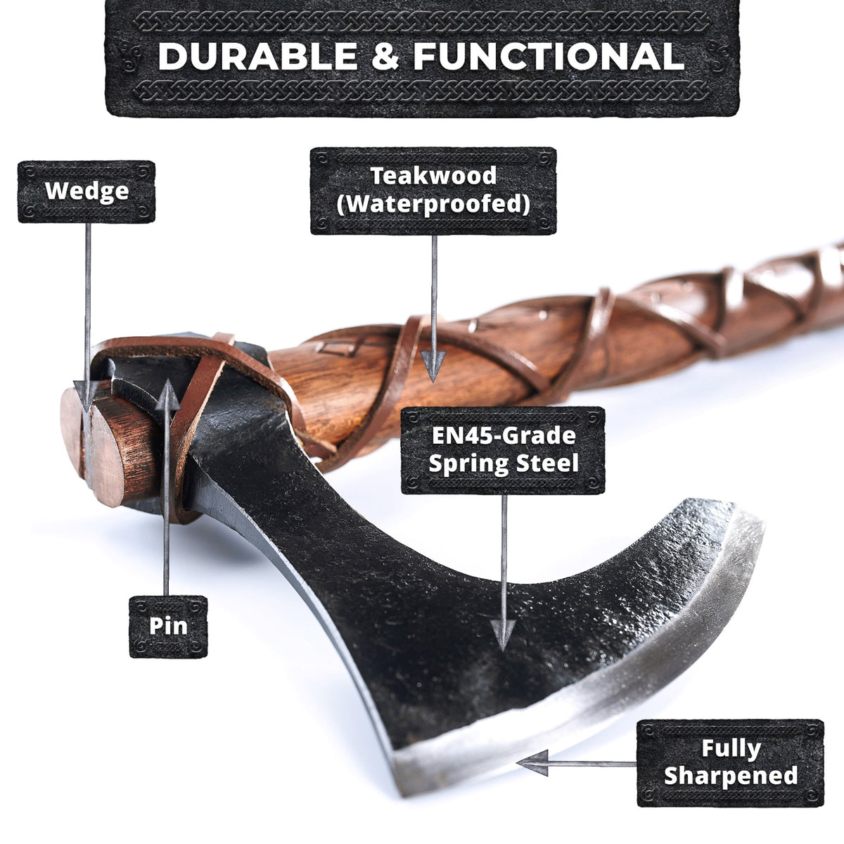 ⚔️ BUILT FOR USE - While we do not endorse this item as a weapon, it is no toy. It is fully functional as a tool or an authentic reenactment piece and features a utility sharp blade edge. The axe handle is made from one piece of quality aged teakwood, one of the most hard and durable timbers available. The handle features features a thick harness leather cross stitch and grip. Also, this axe is NOT a log splitting maul made for chopping heavy logs.