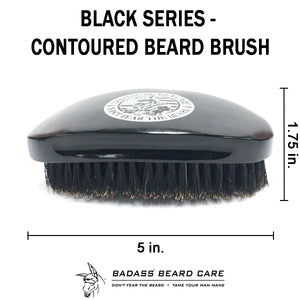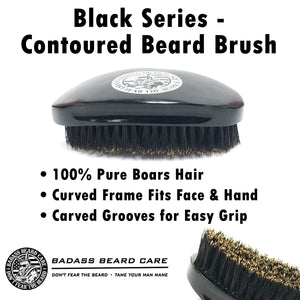 The Black Series Contoured Beard Brush is a masterpiece! The hardwood frame is painted gloss black with a metallic silver logo. The brush is carved to be ergonomically shaped to not just fit your palm but also the curve of your face and jaw. Grooves have been carved out of the side of the brush for a comfortable and easy finger grip. The bristles are 100% pure long black boars hair with a medium stiffness to brush through even the biggest and most dense beard without causing static or pulling hairs out.