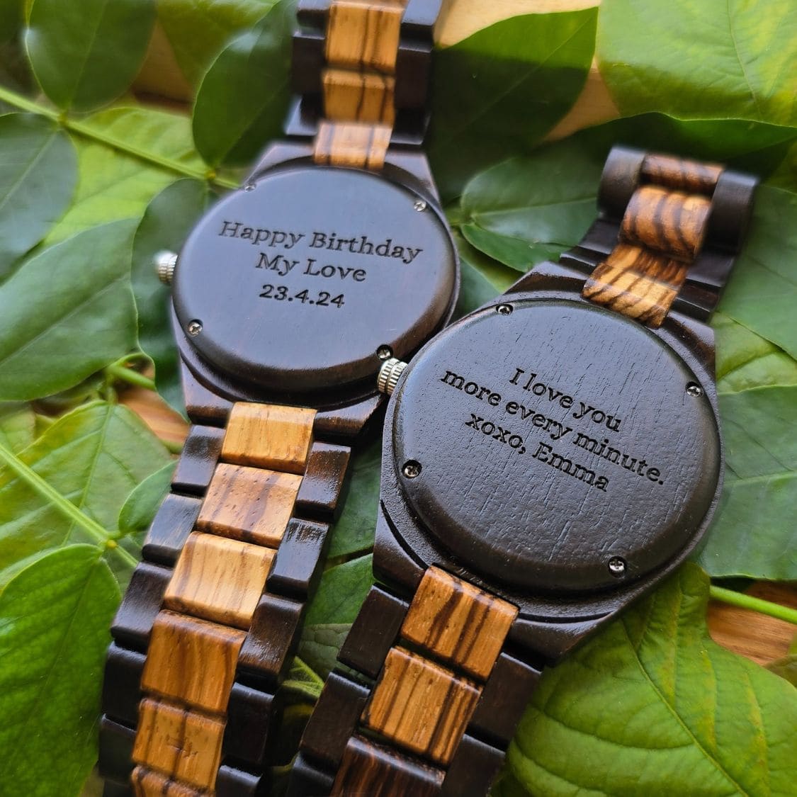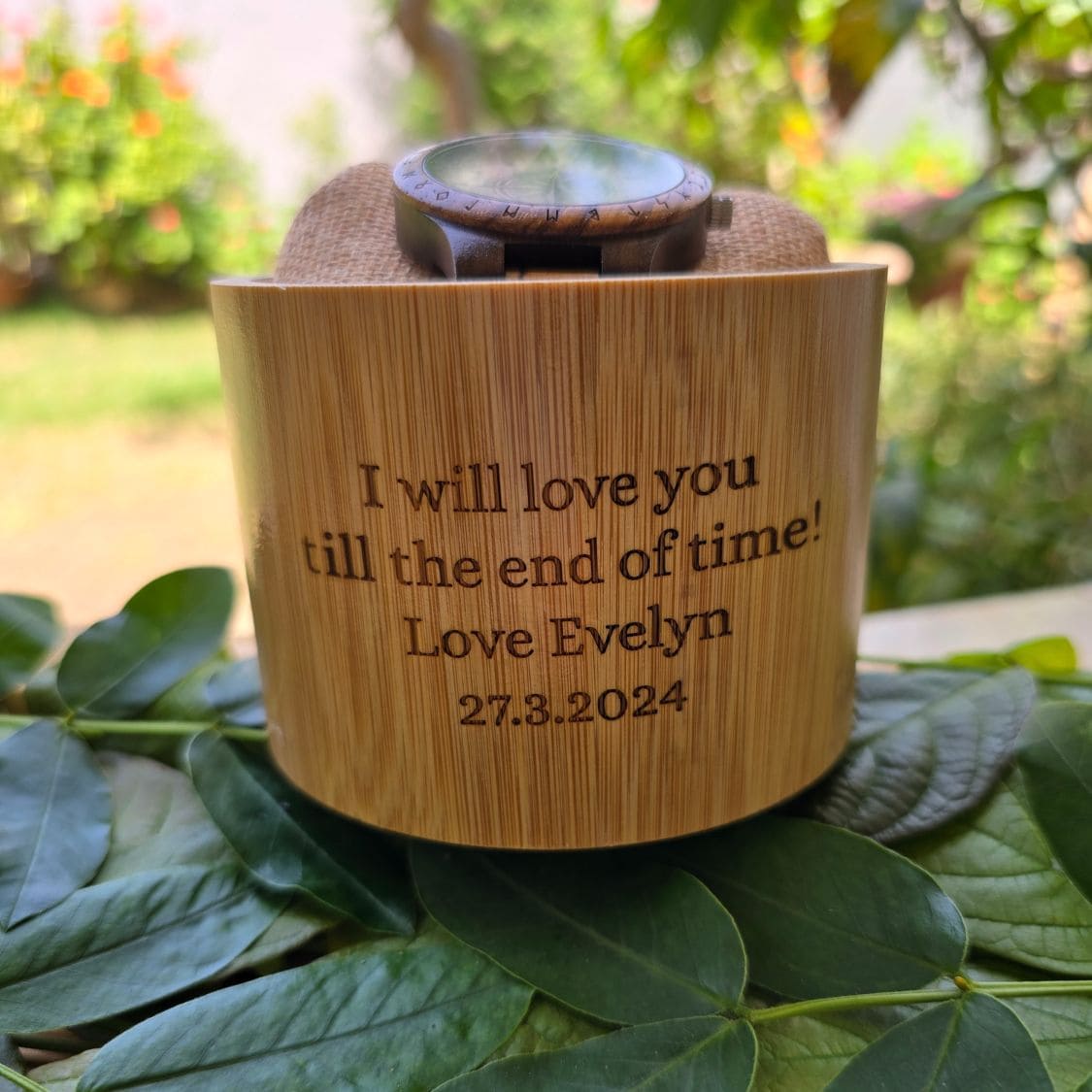 Unique, high-quality wooden watch, engraved with the Vegvisir, runic circle & personalized engraving with your own message on the back & on the box.