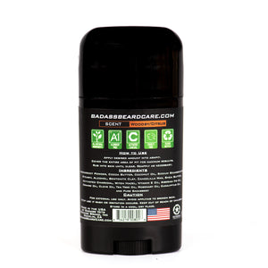 The Badass all-natural Deodorant stick is easy to apply, gentle on skin and provides powerful long-lasting protection. Our advanced formula includes activated charcoal, bentonite clay, baking soda and a unique blend of 8 essential oils to kill odor causing bacteria and absorb excess moisture. Our deodorant is cruelty free (only tested on bearded vets), free of harmful chemicals, parabens, aluminum. The 2.6oz twist up stick is available in 9 badass scents.