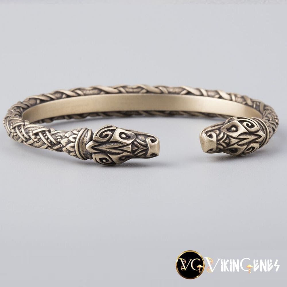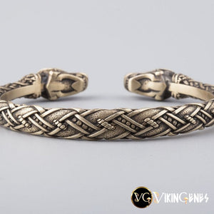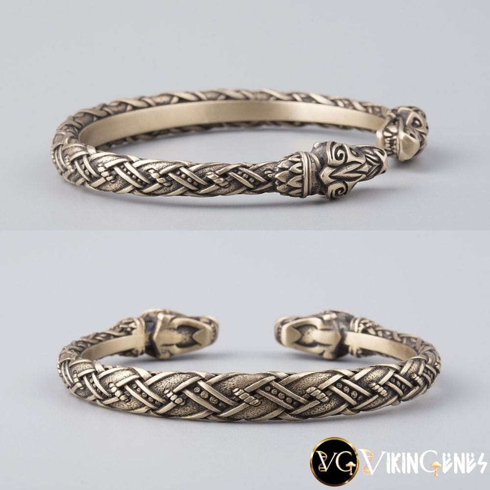 This beautiful hand-crafted Viking bracelet depicts the head of a wolf on each end.