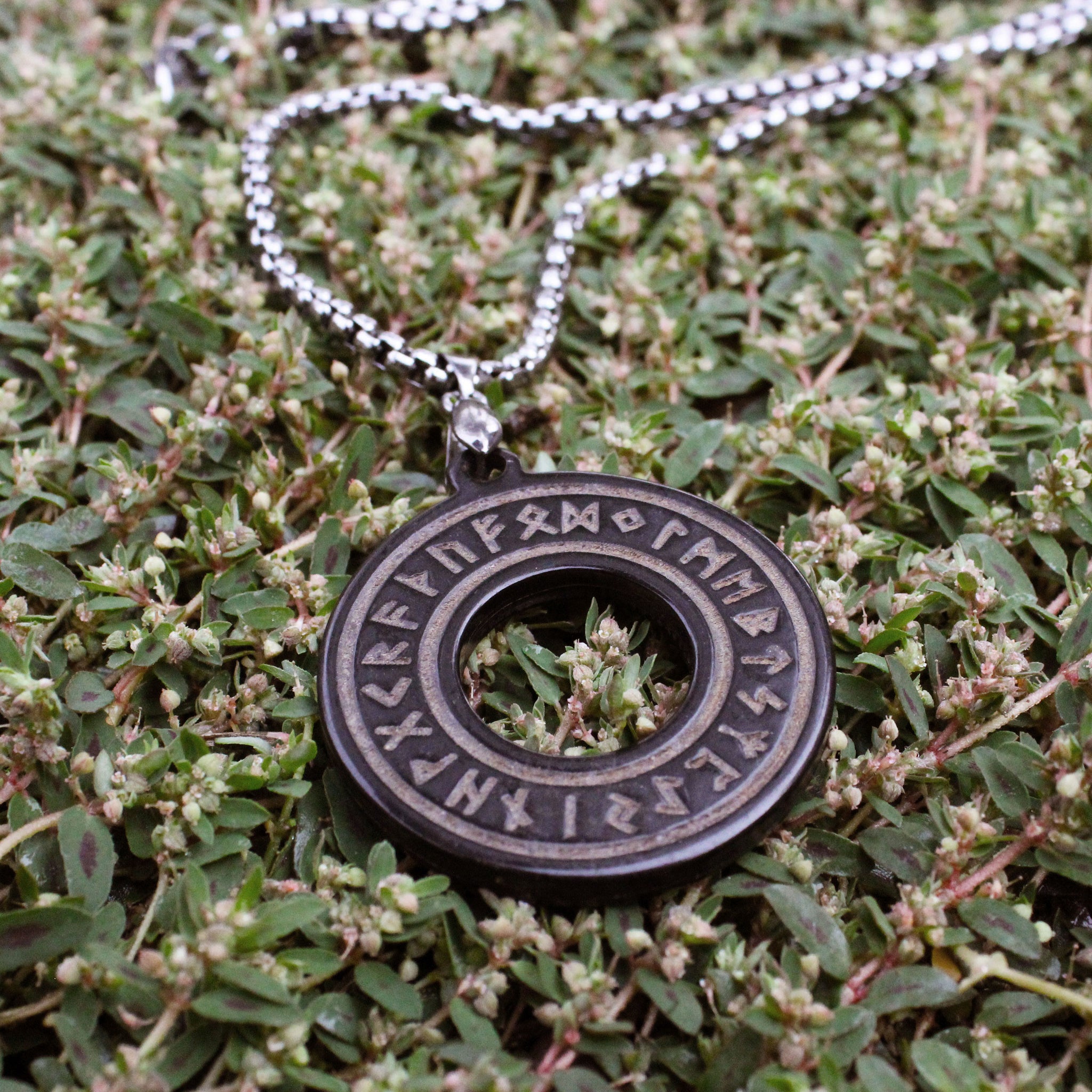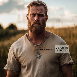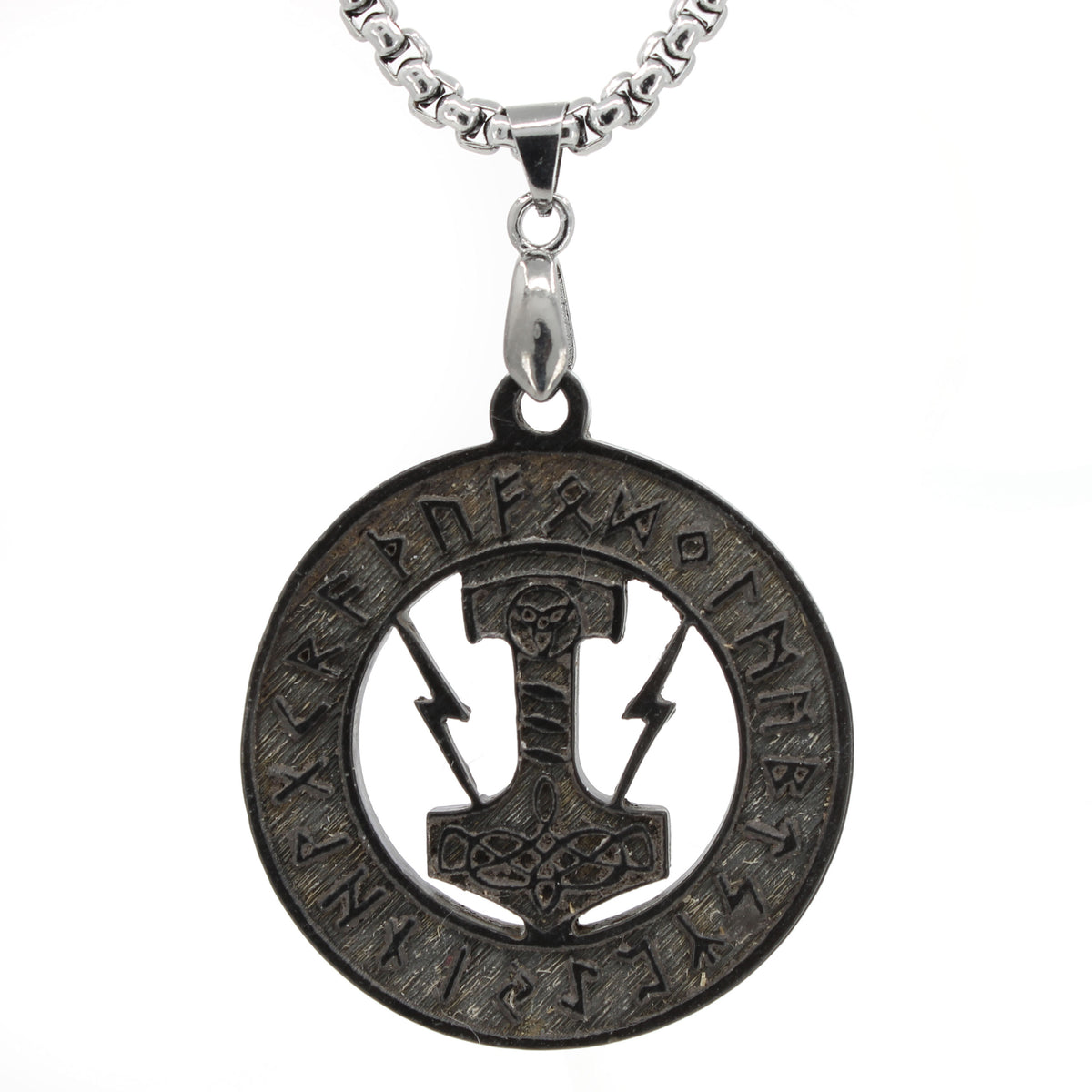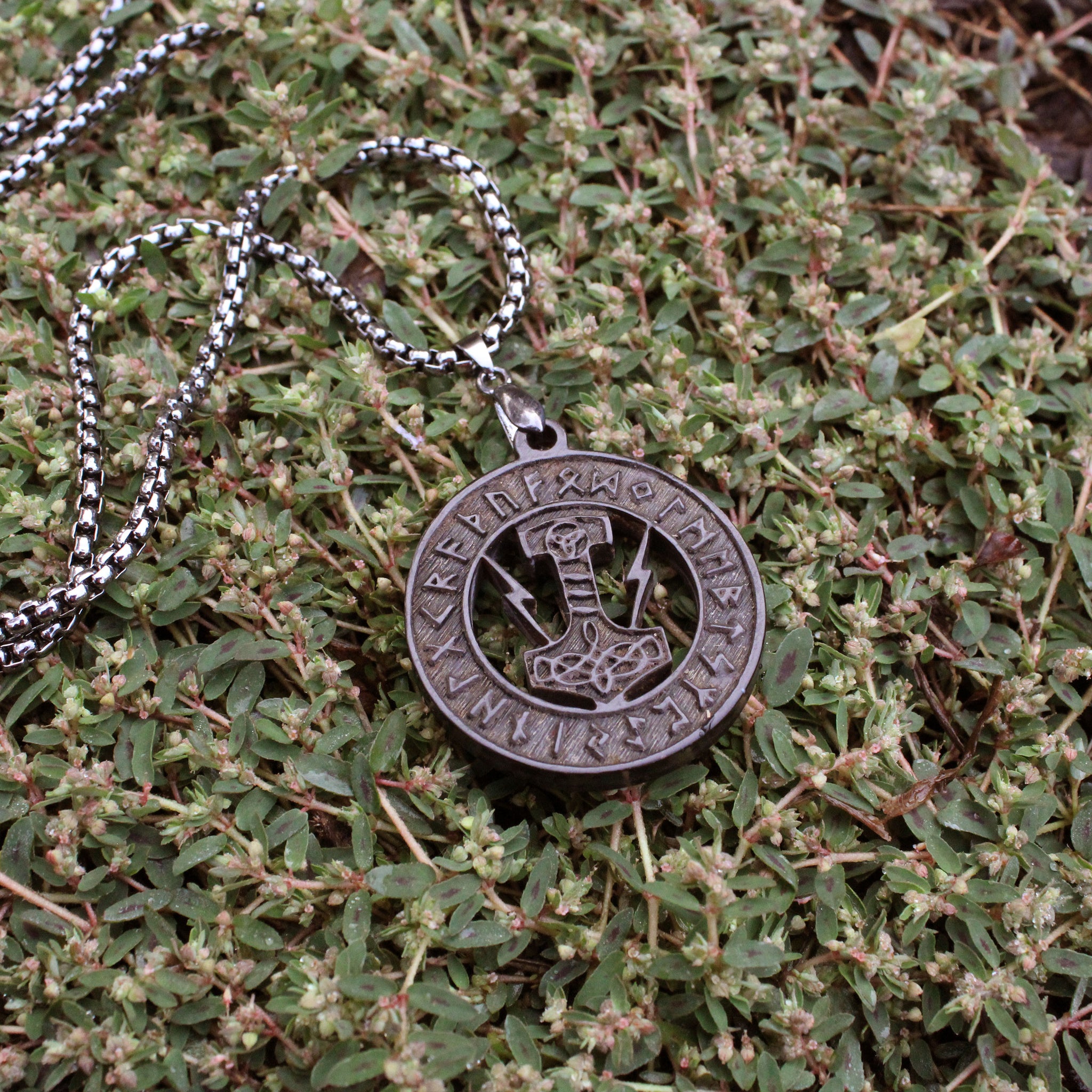 🕯️ Powerful Symbolism: The pendant showcases a laser-engraved design of Thor’s Hammer (Mjolnir) at the center, flanked by lightning bolts and featuring the Triquetra, a symbol of unity and protection. The design is encircled by Elder Futhark runes, connecting this piece deeply to Norse mythology and ancient traditions.